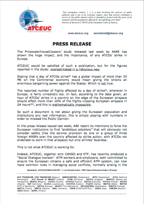 De hecho, ATCEUC, junto con CANSO y ETF, ha publicado recientemente una “herramienta para el Diálogo Social”. Empleados y empleadores ATM, ambos comprometidos con garantizar a los ciudadanos Europeos un sistema ATM seguro y eficiente, pueden ahora tener unas reglas comunes para solucionar conflictos sociales, normales en el mundo democrático. Asociaciones como A4E no tienen ningún derecho a pisotear los derechos de todos los trabajadores en Europa mientras otras partes interesadas se implican en buscar soluciones realistas.