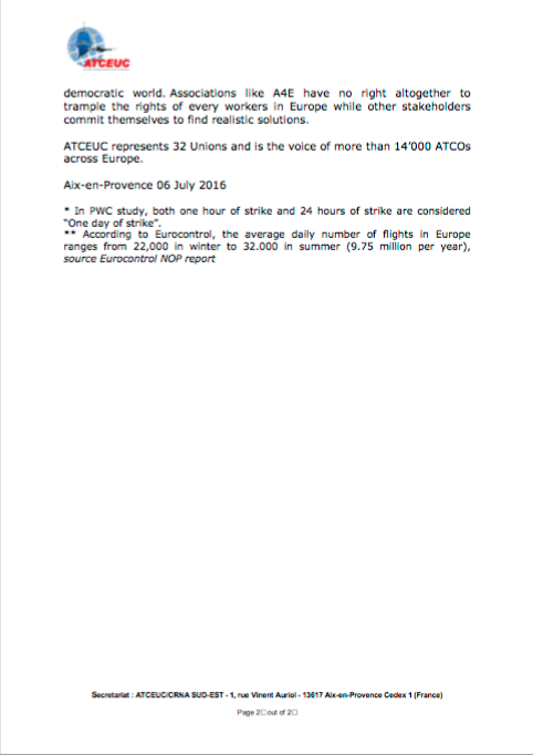 NOTA DE PRENSA, 6/7/2016. El estudio de PricewaterhouseeCoopers’ publicado la semana pasada por A4E muestra el enorme impacto, y la importancia, de cualquier huelga de controladores aéreos en Europa.