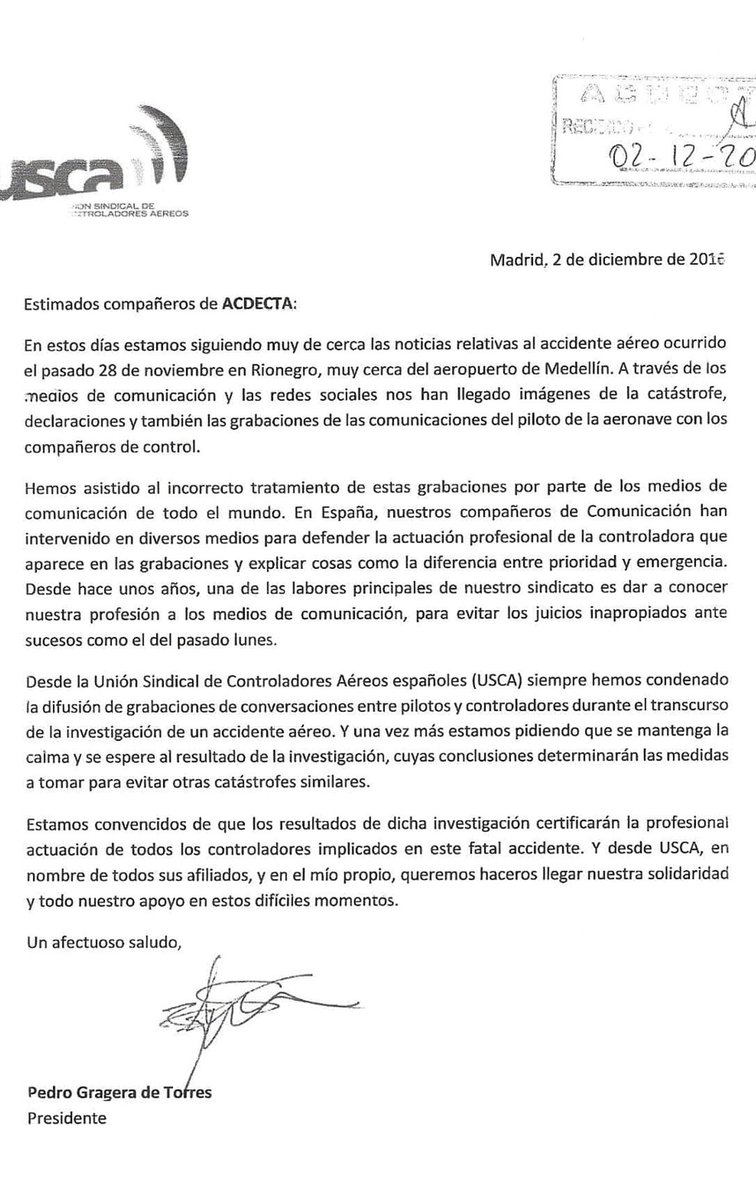 USCA, 2/12/2016. El presidente del sindicato que engloba a más del 90% de los controladores aéreos españoles ha enviado esta carta a sus homólogos colombianos, como muestra de apoyo y solidaridad.