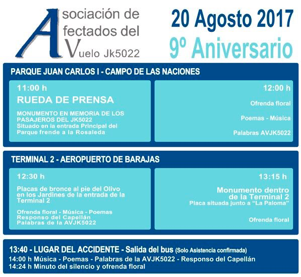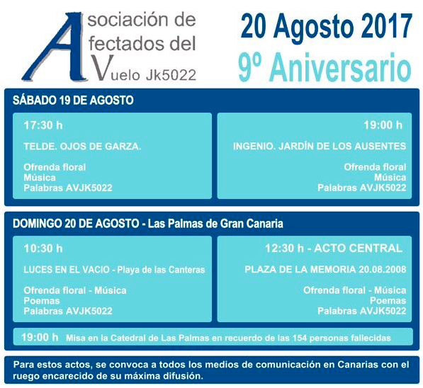 Pilar Vera, la infatigable Presidenta de la Asociación de Víctimas del accidente del Spanair 5022, que se estrelló el 20 de agosto de 2008 cuando despegaba de Barajas destino Gran Canaria, ha convocado, como cada año, una jornada de conmemoración y reivindicación tanto en Madrid como en Gran Canaria para recordar a los fallecidos y poner de manifiesto que nunca se han llegado a investigar las verdaderas causas.