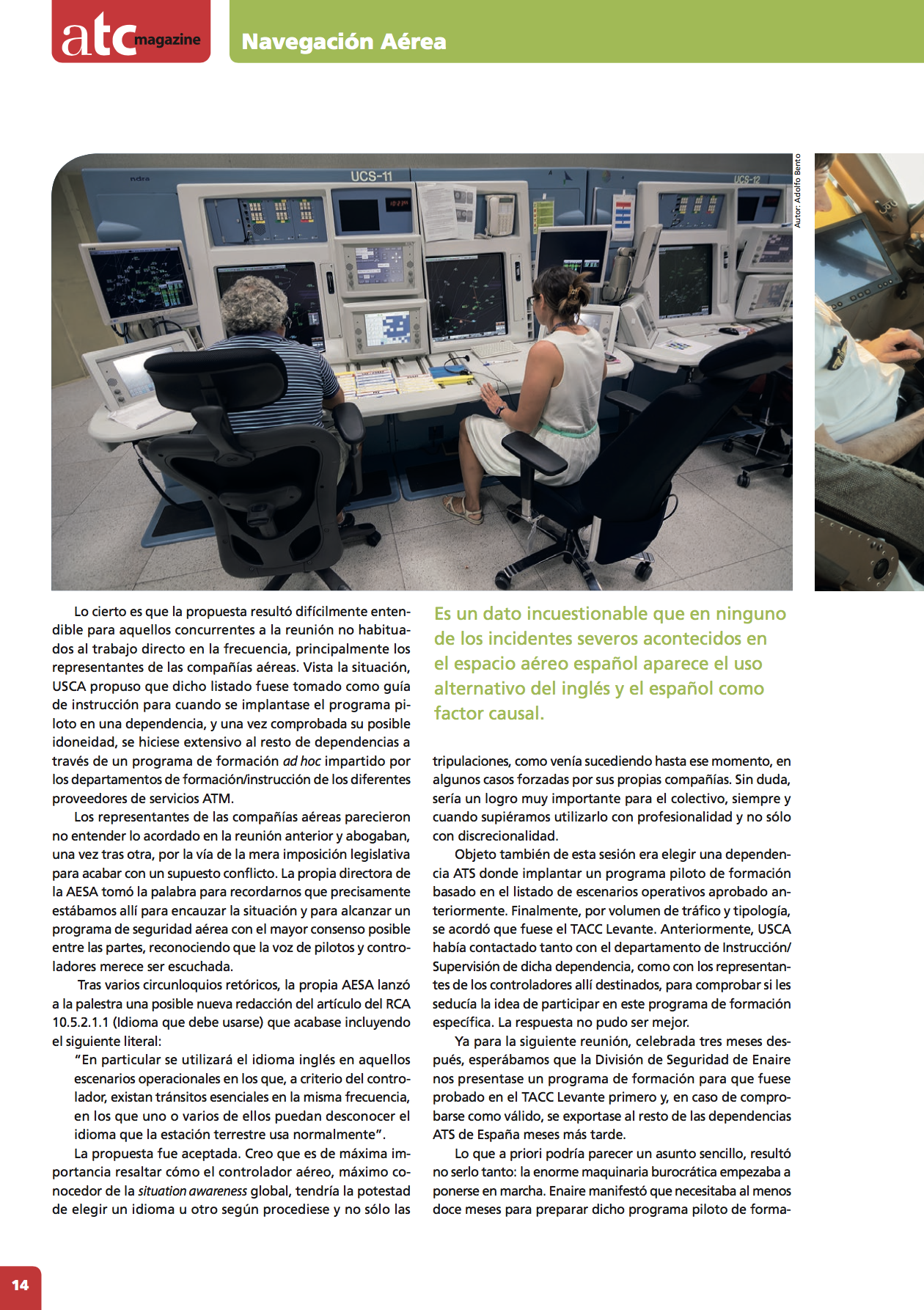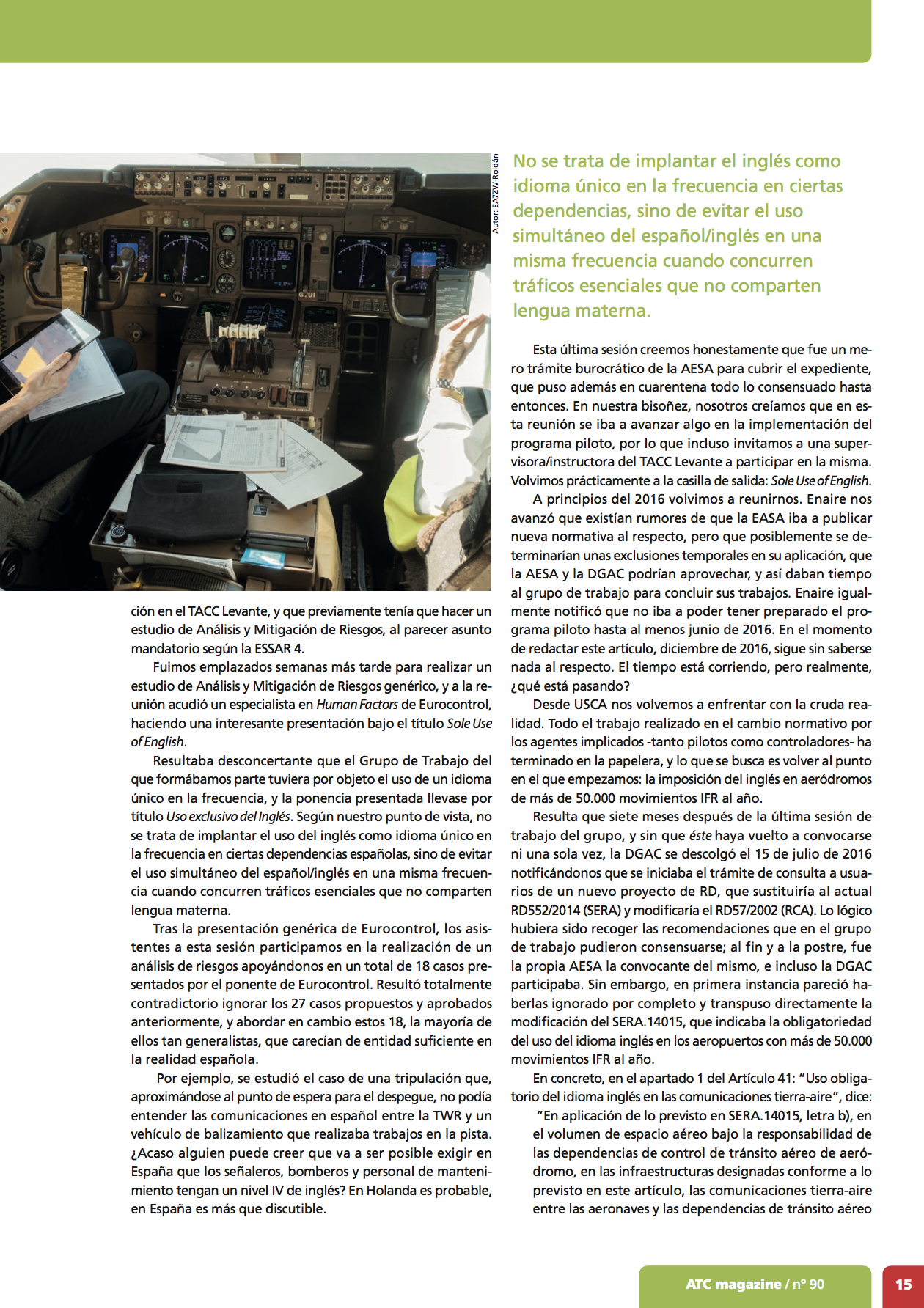 En el número 90 (invierno de 2016) de ATC MAGAZINE, la revista profesional de los controladores aéreos españoles, se publicaba un artículo sobre la problemática de la utilización del inglés como idioma único en frecuencia (pincha aquí para verlo en su formato original). Lo reproducimos íntegramente por su relevancia actual: