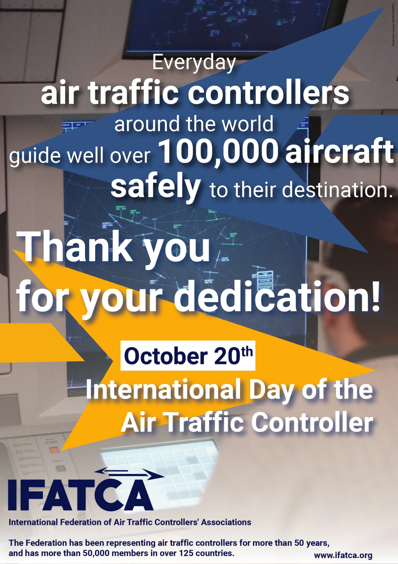 “Un año más celebramos el día internacional del controlador aéreo. El día de una profesión abnegada y altamente especializada que promueve el pilar fundamental de la aviación: La seguridad aérea. La fecha es el 20 de octubre, elegida en conmemoración de la constitución de IFATCA (International Federation of Air Traffic Controllers Associations) hace 56 años, el 20 de octubre de 1961.