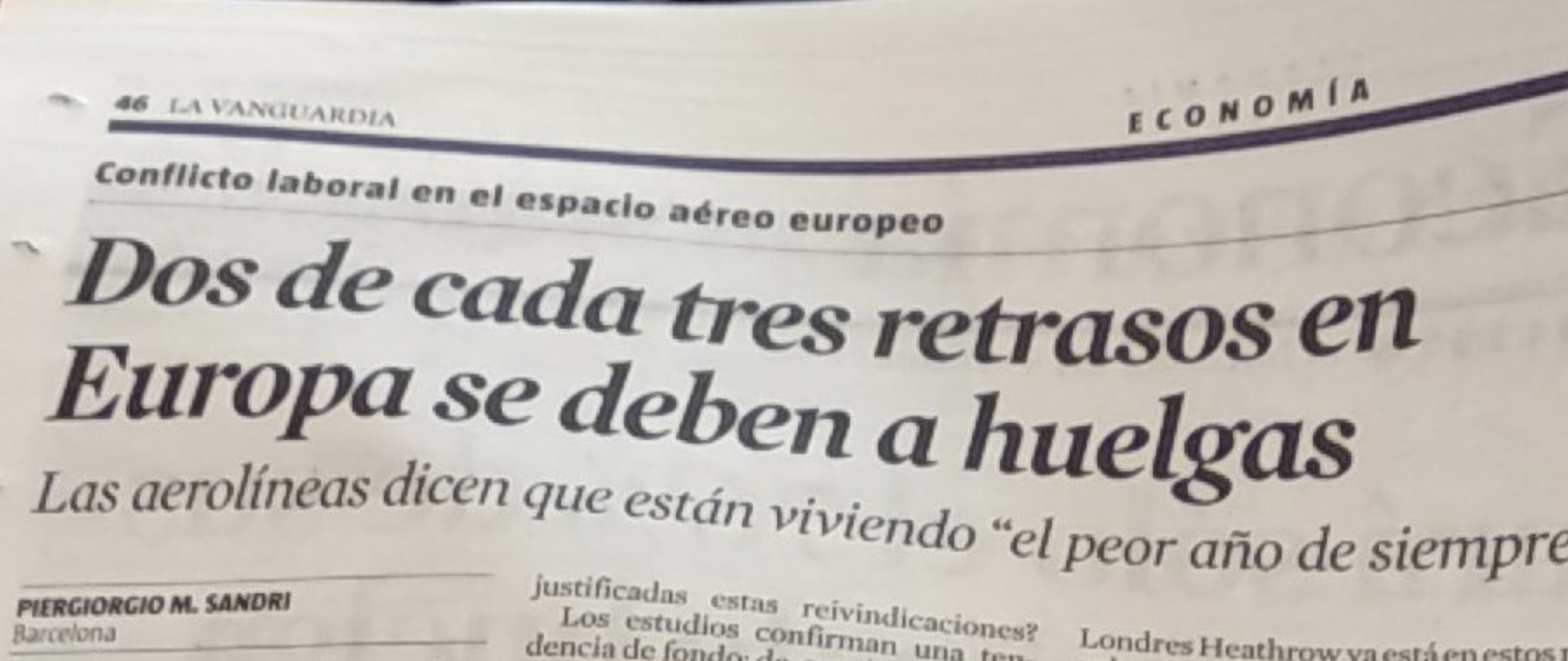 El artículo, sin decirlo explícitamente, se refiere a las huelgas de controladores aéreos, toda vez que los datos que presenta, basados en un fraudulento estudio encargado por el lobby de las aerolíneas europeas, A4E (Airlines for Europe), hace alguno meses, son calcados de éste, sin hablar en ningún momento de que la inmensa mayoría de los retrasos aéreos son imputables directamente a las aerolíneas y que el impacto de las huelgas de trabajadores en el sector aéreo es residual.